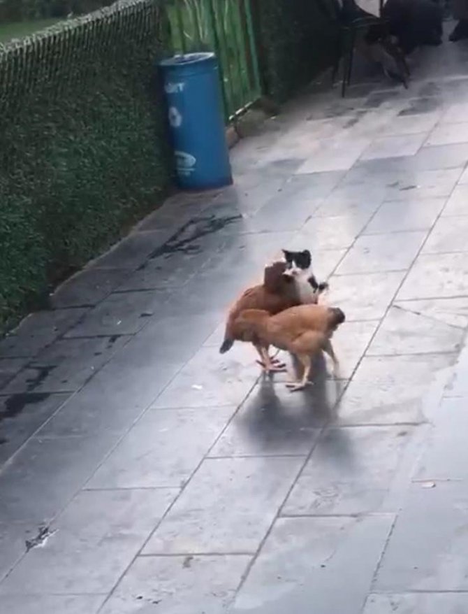 Kedi ile tavukların dostluğu