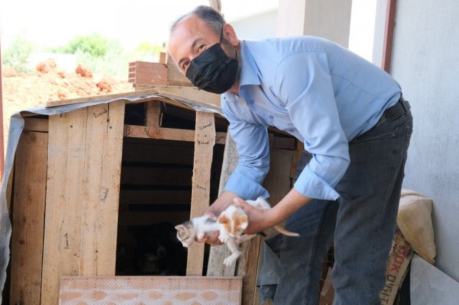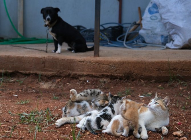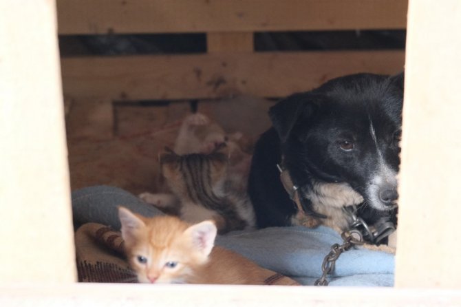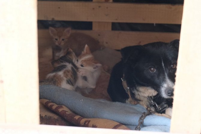 Manisa'da bir köpek, kulübesinde doğum yapan bir kedinin yavrularına bakıcılık yapıyor.