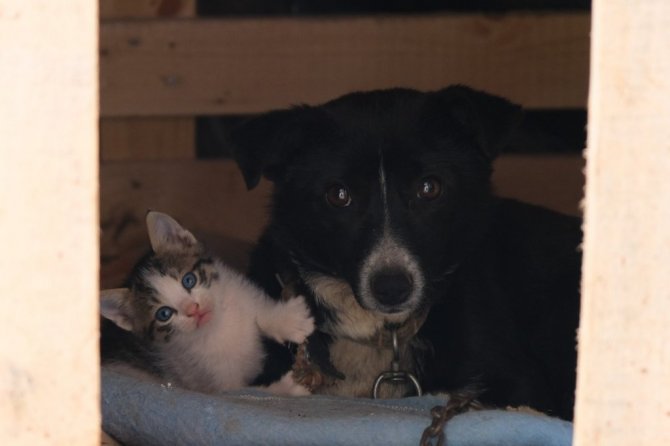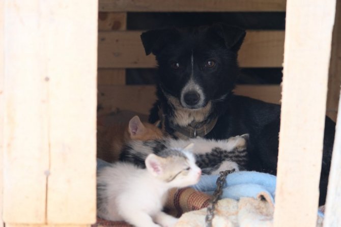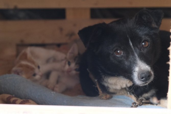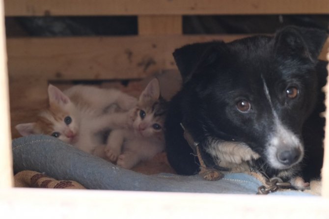 Manisa'da bir köpek, kulübesinde doğum yapan bir kedinin yavrularına bakıcılık yapıyor. Yavru kedilerin yanına kimseleri yanaştırmayan ve onları sahiplenen köpeğin bu davranışı yürekleri ısıttı.