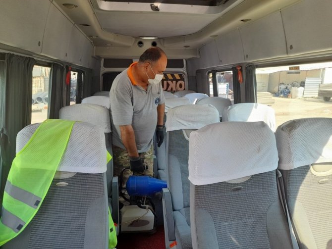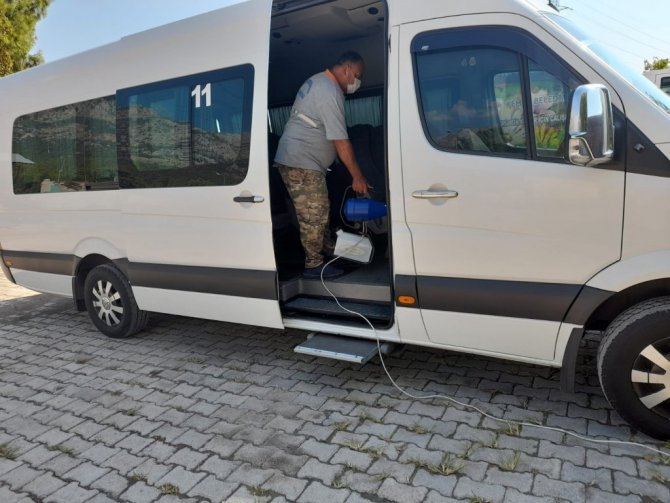 Kemer Belediyesi, yeni eğitim ve öğretim yılının başlamasıyla beraber ilçedeki okul servislerini dezenfekte ediyor.
