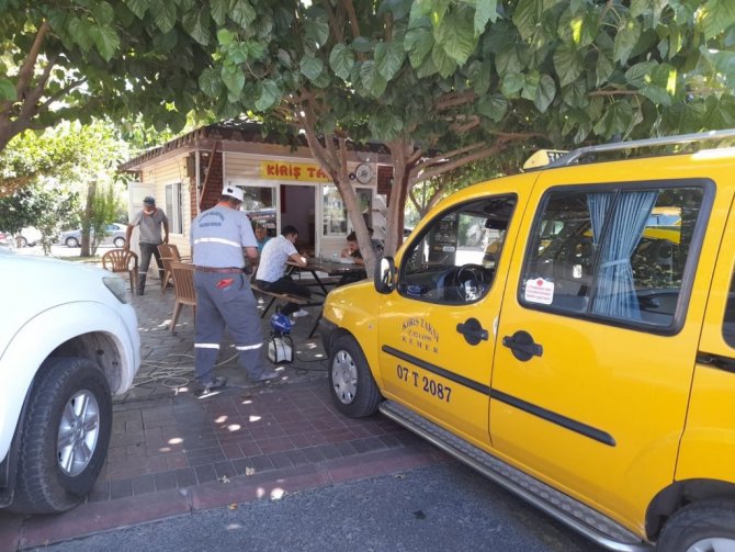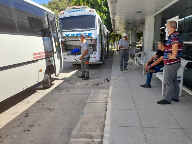Kemer’de taksi ve otobüs duraklarında dezenfekte ve ilaçlama çalışmaları sürüyor