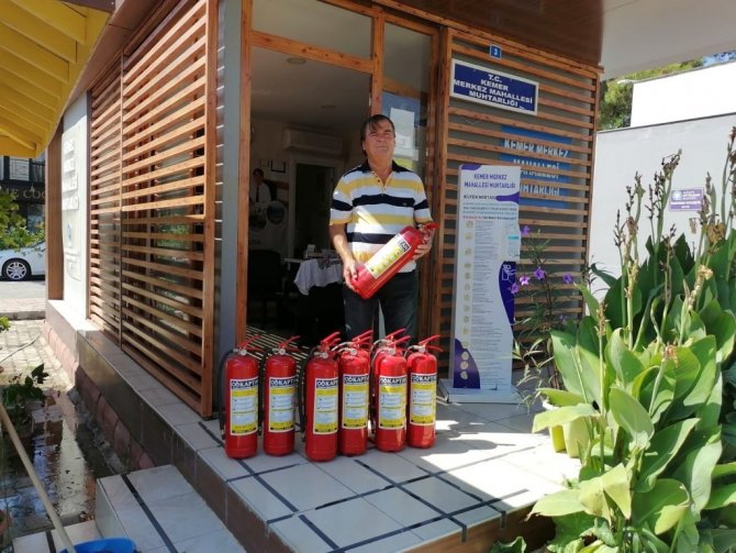 Kemer'de olası yangın ihtimallerine karşı mahalle muhtarlarına yangın tüpleri dağıtılıyor.