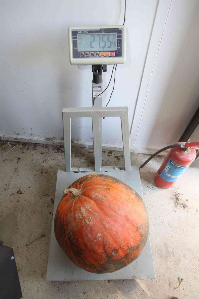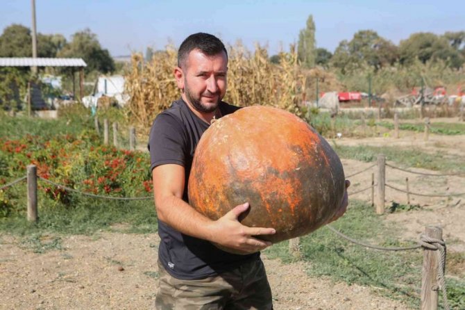Sergilenen kabaklar arasında yer alan turuncu rengi, iri boyutu ve 30 kilograma yakın ağırlığıyla en dikkat çeken Kuzey Amerika menşe'li dev balkabağını bir kişi güçlükle yerinden kaldırıyor.