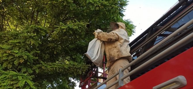 Kent merkezindeki ağaca oğul veren arılara itfaiye müdahale etti