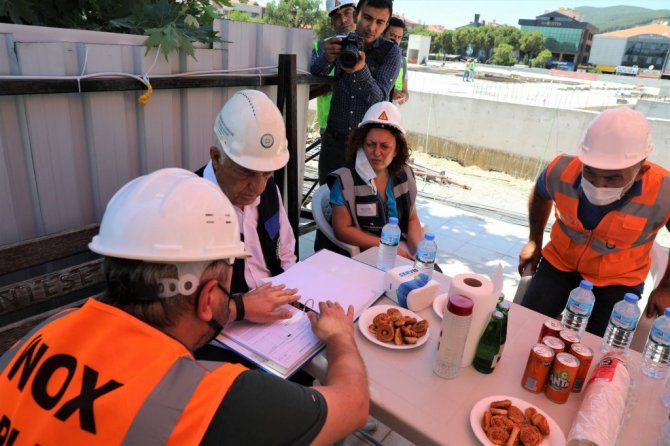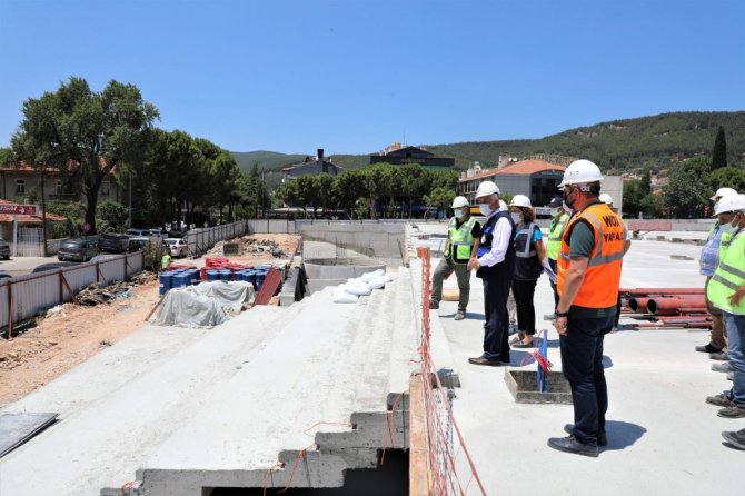 Muğla Büyükşehir Belediye Başkanı Dr. Osman Gürün yapımı devam eden Kent Meydanı inşaatında incelemelerde bulunurken yüklenici firma yetkililerinden bilgi aldı.