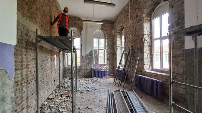Bina çevresine kurulan iskeleler ile dış cephe çalışmalarının da devam ettiğini belirten Mehmet Bayram, burada da su ile temizlik yapılacağını anlatarak, "Kötü durumda olan taşları değiştireceğiz, kurtarabildiklerimizi kurtaracağız. Tek tek elle kaybolan işlemeleri açıp işleyeceğiz. Bahara doğru çatıyı açacağız daha sonra da kapı ve pencereleri de imal ettiğimiz atölyeden çıkarıp açılıştan bir ay kadar önce montajını yapacağız. İç alanda projemizde horasan sıva görünüyor. Eğer kurul ve Belediye Başkanı da uygun görür de sıvadan başka bir şeye çevirmek isterlerse bunun kararını da onlar verecekler" diye konuştu.
