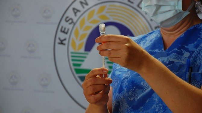 Keşan Çok Amaçlı Pazaryeri Kompleksi'ndeki nikah salonunda 11.00 itibariyle başlayıp 4 saat süren aşılama uygulamasında, 18'i Sinovac ve 156'sı BioNTech olmak üzere toplam 174 kişi aşılandı.