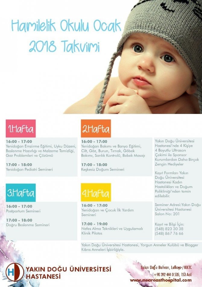 Yakın Doğu Üniversitesi Hastanesi ile sosyal medya fenomenleri Yorgun Anneler Kulübü ve Blogger Kıbrıs Anneleri işbirliğinde organize edilen hamilelik okulu seminer dizisinin ilki gerçekleşti. Ocak ayı boyunca kadın hastalıkları ve doğum, çocuk sağlığı ve hastalıkları, fizik tedavi ve rehabilitasyon, ruh sağlığı ve hastalıkları ile beslenme ve diyetetik uzmanları tarafından çeşitli konularda verilecek seminerlere, ilk kez bebek sahibi olacak anne baba adayları ile yenidoğan konusunda bilinçlenmek isteyen ve seminere katılım başvurusunda bulunan tüm ebeveynler katılabilecek.