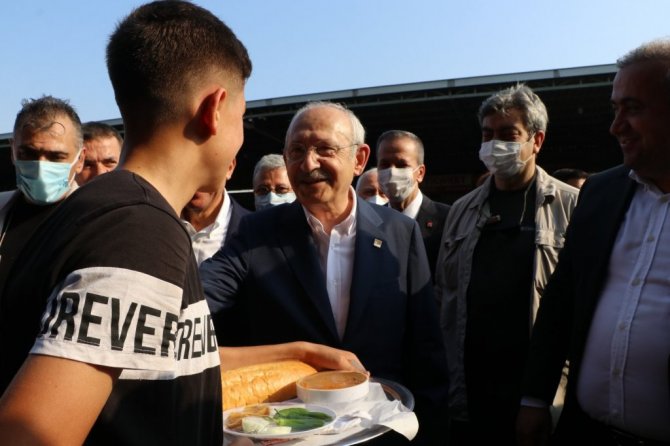Dün gece geldiği Mersin'de Büyükşehir Belediyesinin hayata geçirdiği "Kır Çiçekleri Projesi" kapsamında eğitim alan çocuklarla bir araya gelen Kılıçdaroğlu, Mersin programının ikinci gününde Yaş Sebze ve Meyve Hal Kompleksini ziyaret ederek hal esnafıyla buluştu. Büyükşehir Belediye Başkanı Vahap Seçer ve Mersin Yaş Sebze ve Meyve Komisyoncuları Derneği Başkanı Münir Şen ile milletvekilleri ve bazı partililerin de eşlik ettiği ziyarette, hal esnafı ile sohbet eden ve ürünleri inceleyen Kılıçdaroğlu, kendisini lokantada çorba içmeye davet eden bisikletli bir gence, "Şimdi yapamam bu kalabalıkta" şeklinde yanıt verdi.