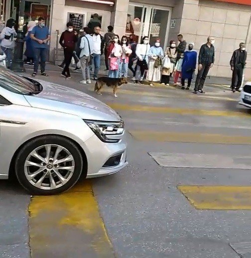 Kırmızı ışıkta bekleyip yeşil ışıkta geçen köpek görenleri şaşırtıyor
