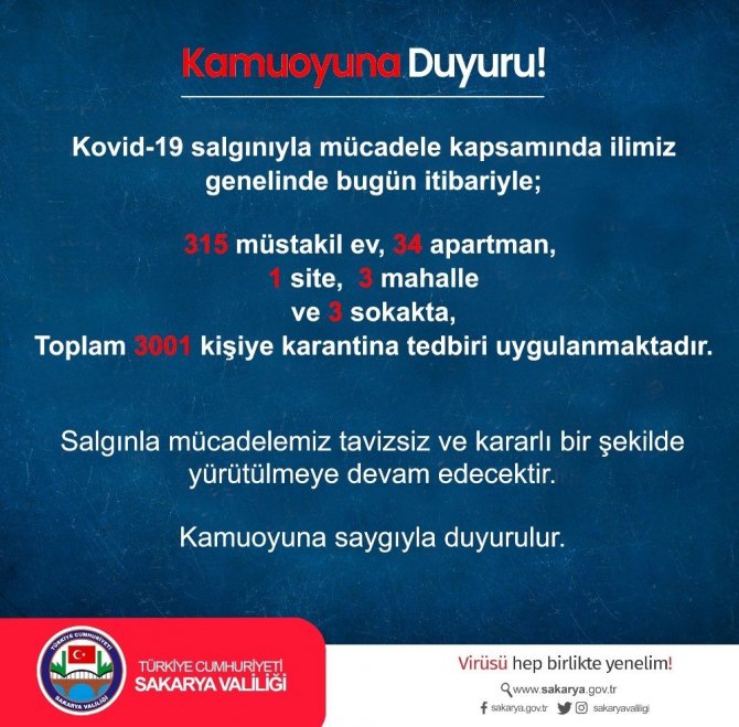 Sakarya Valisi Çetin Oktay Kaldırım, şehir genelinde 1 site, 34 apartman, 315 müstakil ev, 3 mahalle ve 3 sokak olmak üzere toplam 3 bin 1 kişinin karantinaya alındığını duyurdu.