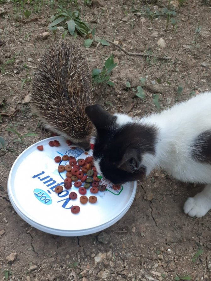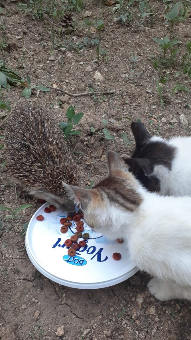Kırıkkale'de iki kedi ile birlikte aynı kaptan beslenen kirpi görenlerin içini ısıttı.
