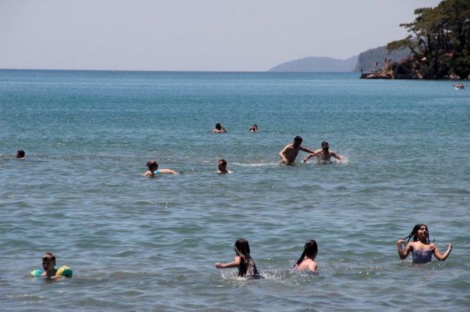 Deniz suyu sıcaklığının 18-20 derece, hava sıcaklığının ise 30 dereceye yaklaştığı Akyaka'da özellikle çocuklar deniz özlemini giderdi.