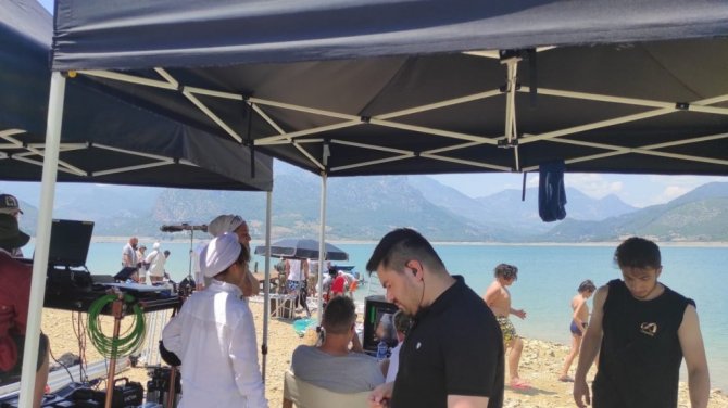 Eşi Başak Dizer'in de eşlik ettiği sanatçı, gün boyu süren çekimlerin ardından ilçeden ayrıldı.