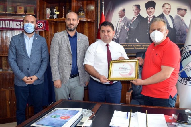 Türk Kızılay Zonguldak Şube Başkanı Aydın Ergenç, GMİS Genel Başkanı Hakan Yeşil'e "Bu hilal sizinle var" belgesi takdim etti.