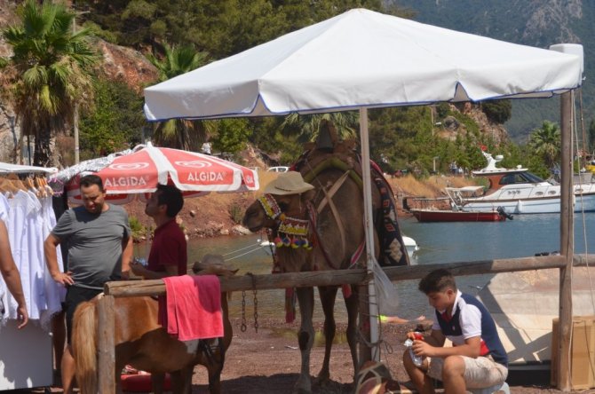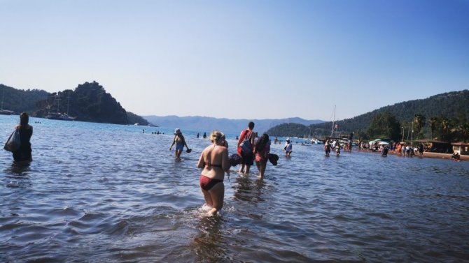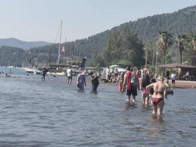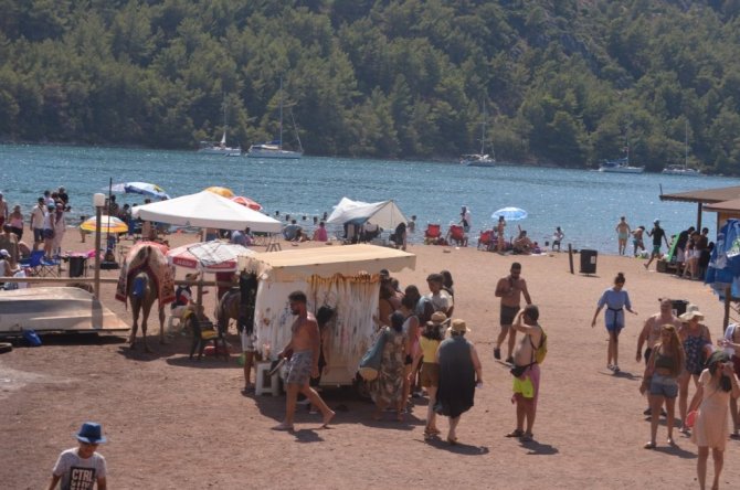 Muğla'nın Marmaris ilçesine 27 kilometre mesafede bulunan Turistik Orhaniye Mahallesi'nin simgesi Kızkumu Plajı yerli ve yabancı turistler ile doldu taştı.