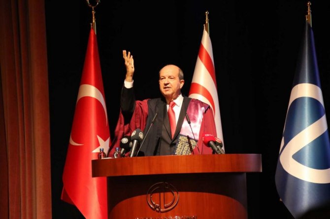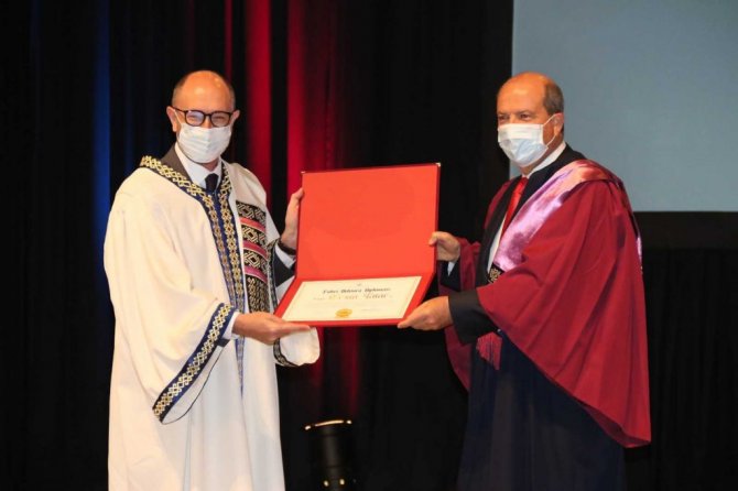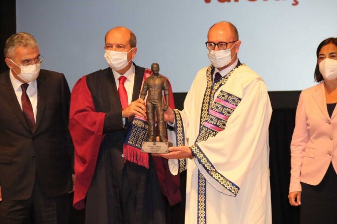 Anadolu Üniversitesi Senatosu'nun oybirliğiyle aldığı kararla Rektör Erdal tarafından KKTC Cumhurbaşkanı Ersin Tatar'a "fahri doktora unvanı" verildi. Programda, geleneksel açılış dersini veren Cumhurbaşkanı Tatar, Kıbrıs Türklerinin adadaki varoluş mücadelesini anlattı. Törendeki konuşmasında KKTC muhalefetini eleştiren Cumhurbaşkanı Tatar, "Oyunun ne olduğunu bilmek zorundayız. Tabi bunu zaman zaman televizyon ekranlarından hep birlikte izliyoruz. Televizyonlarda çeşitli haritalar gösteriyorlar, uzmanlar çeşitli değerlendirmeler yapıyor. Birtakım sinsi oyunlarla hepimiz karşı karşıya olabiliriz ama oyunun ne olduğunu bilmek durumundayız. Kuzey Kıbrıs Türk Cumhuriyeti'nden baktığımızda oyun böyle görülüyor. Orada da mücadelem devam ediyor, orada da muhaliflerim var. Halen daha federasyona inananlar var. Bunların başında eski Cumhurbaşkanı Mehmet Ali Talat ve son olarak Mustafa Akıncı ve onların adamları gelmektedir. Bana her türlü suçlamayı da yapıyorlar. Beni "Ankara'nın papağanı" olarak tanıtmaya devam ediyorlar. Beni dünya aleme şikâyet ediyorlar. Ben Türkiye'yi temsil eden bir kişiymişim, Kıbrıs Türk halkını temsil etmezmişim; ben bunu asla kabul etmem. Benim yüreğim elbetteki Kıbrıs Türk halkının hak ve çıkarlarını korumak. Bu hak ve çıkarları korurken Kuzey Kıbrıs Türk Cumhuriyeti'nin devamı için yapılan bütün çalışmalarda Türkiye Cumhuriyeti'nin de desteğine ihtiyacımız olduğunu her vesileyle söylüyorum. Aksi takdirde o adada Kıbrıs Türklerini yok etmek onlar için o kadar zor olmaz. Eğer Türkiye oradan çekilirse askeriyle, varlığıyla Avrupa Birliği içinde bizlerin o mücadeleyi vermemiz kolay olmayacaktır" dedi.