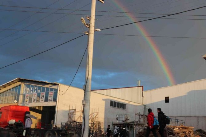 Hava sıcaklığının 19 derece ölçüldüğü Kocaeli'de, sabah saatlerinde kısa süreli yağış etkili oldu. Kent merkezinde yaklaşık 10 dakika süren yağışın ardından ortaya çıkan gökkuşağı ise renk cümbüşü yaşattı. Eşsiz görsel sunan gökkuşağı, izleyenleri kendine hayran bıraktı. Seyrine doyumsuz manzara, vatandaşlar tarafından cep telefonlarıyla da görüntülendi.