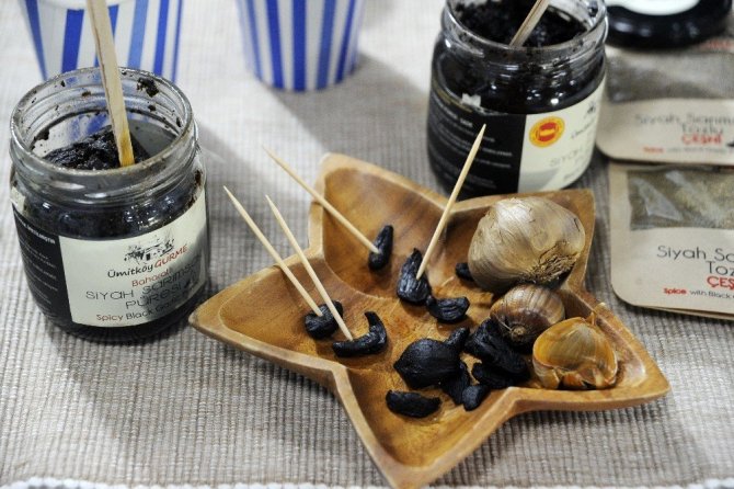 Fuarda yer alan diğer dikkat çekici ürün olan kokusuz siyah sarımsak hakkında bilgi veren Ümitköy Gurme firmasının yetkilisi Şule Tükel, "Taşköprü sarımsağını kullanıyoruz. Sarımsağı 20-25 günlük özel bir fırın içinde 45-50 derece gibi düşük bir ısıda fermante ediyoruz. Bu fermantaston sırasında herhangi bir işlem yapılmıyor, ışıktan yoksun bir ortamda, düşük ısıda bekleyerek fermante oluyor. Besin değerleri arttıkça içindeki antioksidan değerleri arttıkça sarımsak rengini koyulaştırıyor ama asitini bırakıyor. Sarımsak asitini bıraktığı için ağızda bıraktığı keskin kokusu kayboluyor. Bu da sarımsağı günlük yaşamımızda rahatlıkla tüketmemizi sağlıyor. Sarımsağın içindeki lezzetler ortaya çıkıyor. Sarımsağın bu işlemden sonra antioksidanlarının artmasından dolayı rengi koyulaşmış oluyor. Şu anda dünyada süper gıda olarak geçen yükselen bir trende sahip. Çünkü hem besin değeri yüksek hem de lezzetli bir gıda" açıklamasında bulundu.