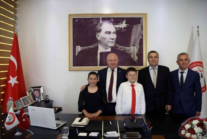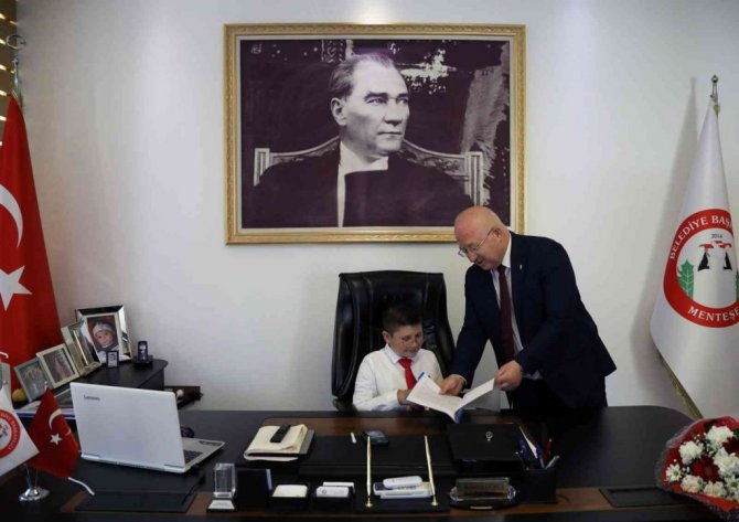Menteşe'de başkanlık koltuğuna oturan 4-D sınıfı öğrencisi Ahmet Emin Tanışman'a Menteşe Belediye Başkanı Bahattin Gümüş tarafından Fen İşleri...