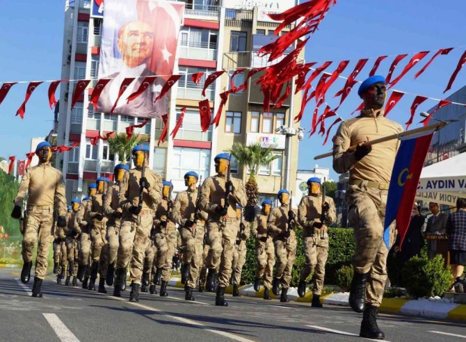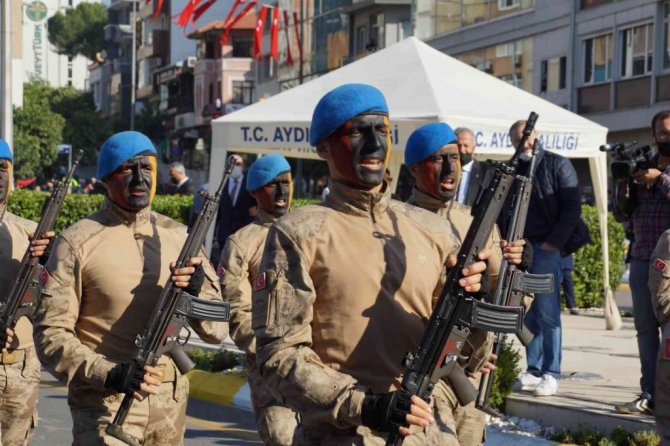Aydın'da 29 Ekim Cumhuriyet Bayramı törenlerinde komando taburunun gösterisi izleyenleri mest ederken, bayram coşkusu ikiye katlandı.
