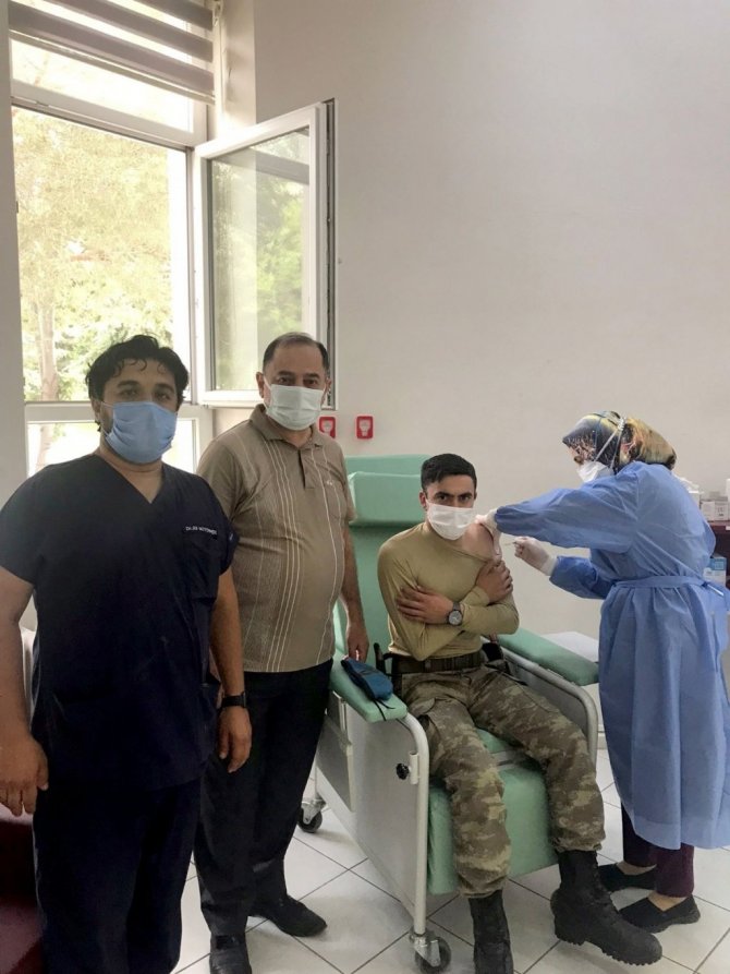 Yapılan genel sağlık sorgulamasının ardından Covid-19 aşısı uygulanan erbaşlar, kısa süre gözetim altında tutulduktan sonra görev yerlerine döndü.