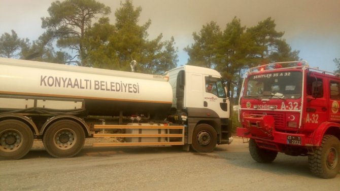 Antalya'nın Manavgat bölgesinde devam eden orman yangınlarında Konyaaltı Belediyesi'nin iş makineleri, arazöz ve yangına müdahalelerde deneyimli personeli söndürme çalışmalarına destek vermeyi sürdürüyor.