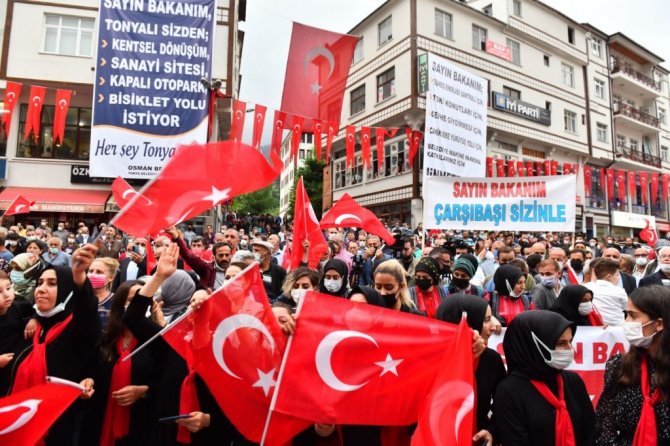 İlçe merkezini dolduran Tonyalılar'a hitaben bir konuşma yapan Bakan Murat Kurum, "Bu saatte buraya geldiğiniz için, şu güzelliği bizlere yaşattığınız için, Konyalı bir kardeşiniz olarak diyorum ki; Bizim için, bu saatten sonra Ha Konyaaa! Ha Tonyaaa!" demesi büyük alkış aldı.
