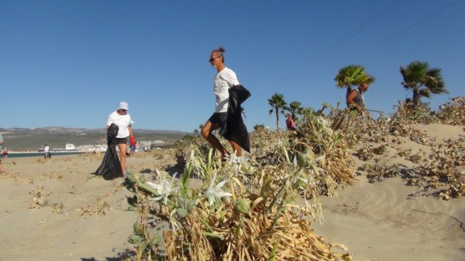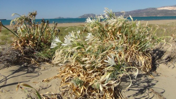 Mersin'in Silifke ilçesinde 25 kilometrelik uzunluğa sahip kumsalda yetişen kum zambakları, çiçek açmaya başladı. Nesli tükenme tehlikesi altında olan ve Dünya Doğa Koruma Birliği'nce koruma altına alınan kum zambağını koparmanın cezası ise 80 bin TL.