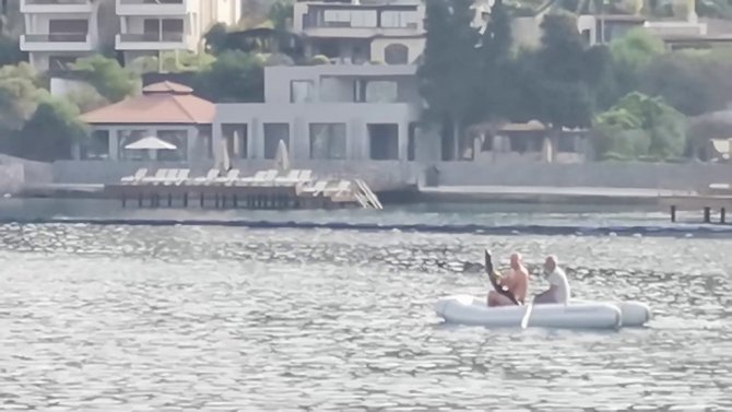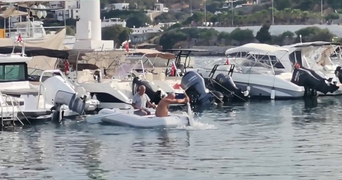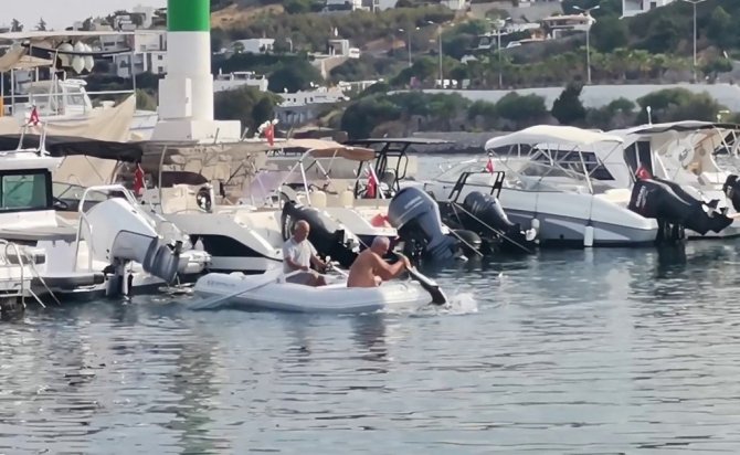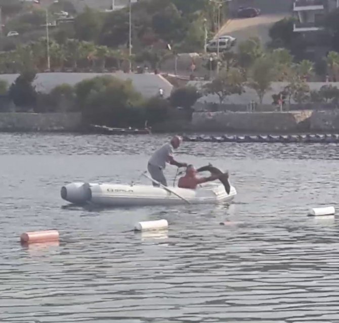 Muğla'nın Bodrum ilçesinde koya gelen köpek balığı, vatandaşlarca yakalanarak güvenli alana bırakıldı. O anlar cep telefonuyla görüntülendi.