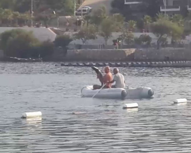 Muğla'nın Bodrum ilçesinde koya gelen köpek balığı, vatandaşlarca yakalanarak güvenli alana bırakıldı.