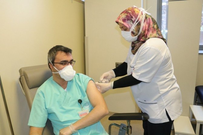 Başhekim Yardımcısı Mete Selvi de "Sağlık personeline aşı işleminin başlamasıyla birlikte bir hekim olarak biz de aşı yaptırdık. İnşallah hepimize hayırlı olur, ülkemiz milletimiz bu hastalıktan kurtulur" şeklinde konuştu.
