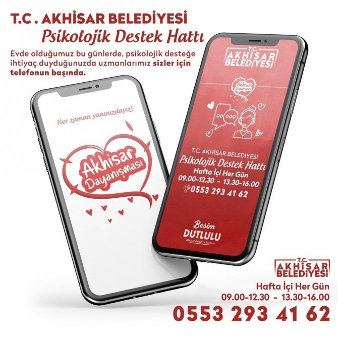 Akhisar Belediyesi, korona virüs salgını nedeniyle oluşturduğu psikolojik destek hattı ile vatandaşların süreçle başa çıkmalarına yardımcı oluyor. Korona virüs salgını veya diğer sebeplerden dolayı kaygı, korku ve stres gibi duygular yaşayan vatandaşların Akhisar Belediyesi Psikolojik Destek Hattı’nı arayarak uzman psikologlarla görüşebileceğini söyleyen Akhisar Belediye Başkanı Besim Dutlulu, "Bu zor dönemde halkımıza psikolojik destek de sağlayarak onlara yardımcı oluyoruz. Duygusal ve psikolojik açıdan da bu süreçle başa çıkacağız” dedi.
