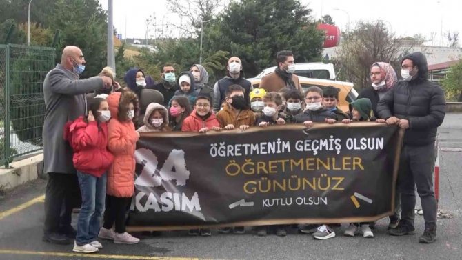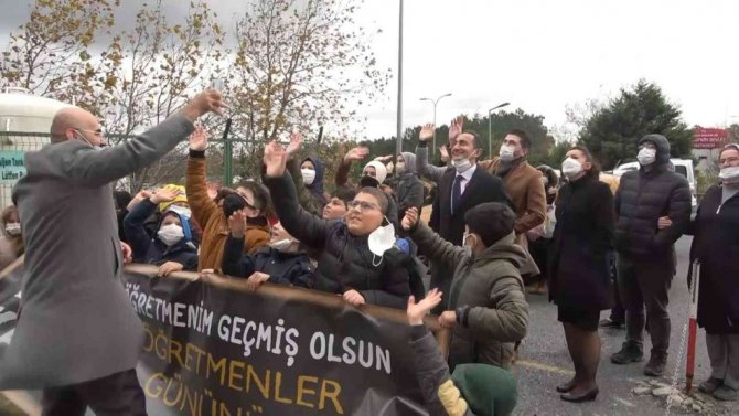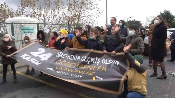 Arnavutköy'de hastane bahçesinde toplanan öğrenciler, koronavirüs tedavisi gören öğretmenlerinin Öğretmenler Günü'nü açtıkları pankartla kutladı. Soğuk havaya aldırmadan hastane bahçesine gelen öğrenciler, görüntülü konuştukları öğretmenlerini duygulandırdı.