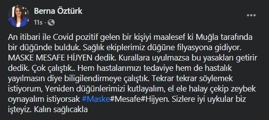 Sosyal medyadan yaptığı paylaşımda Öztürk, “An itibari ile Kovid pozitif gelen bir kişiyi maalesef ki Muğla tarafında bir düğünde bulduk. Sağlık ekiplerimiz düğüne filyasyona gidiyor. Maske, mesafe, hijyen dedik. Kurallara uyulmazsa bu yasakları getirir dedik. Çok çalıştık. Hem hastalarımızı tedaviye hem de hastalık yayılmasın diye bilgilendirmeye çalıştık. Tekrar tekrar söylemek istiyorum, yeniden düğünlerimizi kutlayalım, el ele halay çekip zeybek oynayalım istiyorsak maske, mesafe, hijyen. Sizlere iyi uykular biz işteyiz. Kalın sağlıcakla” dedi.