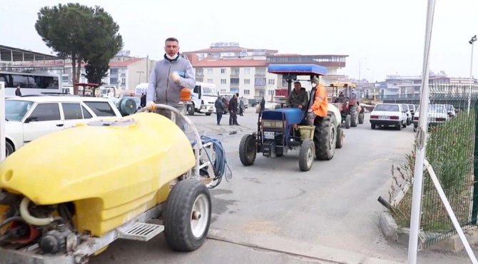 Alaşehir Belediyesinin korona virüs salgınına karşı mücadele kapsamında yürüttüğü dezenfekte çalışmalarına bazı üreticiler de belediyenin çağrısı üzerine traktörleriyle katılarak destek verdi.