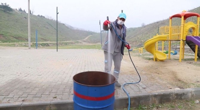 Alaşehir Belediyesi hazırlamış olduğu dezenfektanları, iş makineleriyle tüm şehri dezenfekte etti. Belediyenin iş makinelerine ilave olarak, 10 vatandaş da traktörlerine ilaç atma aparatlarını takıp gelerek destek verdi. Alaşehir’in tüm cadde ve sokaklarının yanı sıra, çöp bidonları, çocuk parkları, açık park alanları ve oturma grupları dezenfekte edildi.