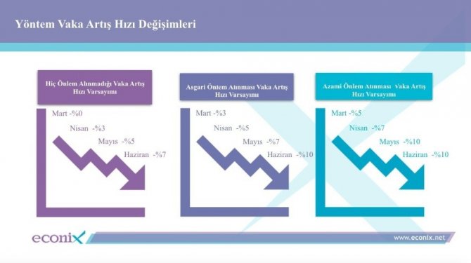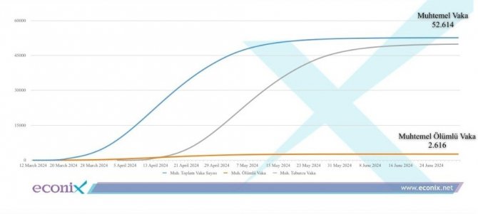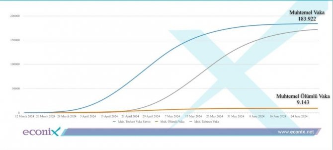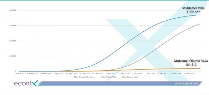 Econix Araştırma, Türkiye özelinde koronavirüsün (kovid-19) bugüne kadarki yayılım verileri ve tıp literatüründen hareketle vaka sayısının değişimine dair 3 senaryo hazırladı. Sosyal izolasyonun yeterli düzeyde sağlanmaması durumunda vaka sayısının Haziran ayı sonunda 3 milyonu aşabileceği tahmin ediliyor. Ancak etkin tedbirlerle salgının Mayıs ayı başında kontrol altına alınabileceği belirtiliyor.