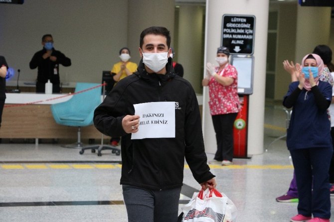 Manisa Merkezefendi Devlet Hastanesi’nde tedavileri tamamlanan korona virüs (Covid-19) hastaları alkışlarla taburcu edilirken, hastalar ellerinde “Hakkınızı helal ediniz” yazılı afişlerle hastaneden ayrılarak sağlık çalışanlarına teşekkür etti.