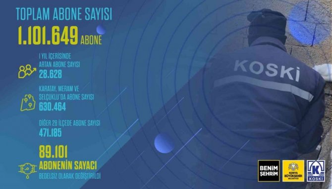 Türkiye'nin en geniş coğrafyasında, 42 bin kilometrekare alanda su ve kanalizasyon hizmeti veren Konya Büyükşehir Belediyesi KOSKİ Genel Müdürlüğü, yeni abone olan 28 bin 628 kişiyle beraber 1 Ocak 2022 yılı itibariyle toplam 1 milyon 101 bin 649 aboneye ulaştı.