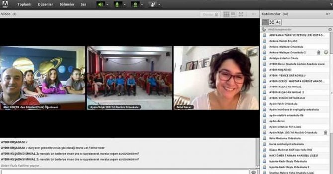 Aydın Köşk 100. Yıl Atatürk Ortaokulu’nda Milli Eğitim Bakanlığı Bilgi İşlem Dairesi Başkanlığı desteği ile gerçekleştirilen e-konferansa, Amerika’da bulunan NASA Astrobiyoloji Enstitüsünde görev yapan SAGANET Astrobiyoloji Eğitim Platformu’nun kurucularından ve halen Harvard Üniversitesi Organizmik ve Evrimsel Biyoloji Bölümünde öğretim görevlisi olan Türk Astrobiyolog Dr. Betül Kacar katıldı. Öğrencileri astrobiyoloji hakkında bilgilendiren Dr. Kacar, öğrencilerin sorularını da cevaplayarak e-konferansa aktif olarak katılımlarını sağladı.