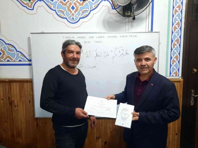Muğla'nın Köyceğiz İlçe Müftülüğüne bağlı Toparlar Merkez Camii ile Pınar Akyaka Camiinde Diyanet İşleri Başkanlığının, "Camilerde Kur'an Öğretimi Programı" kapsamında açılan Kuran-ı Kerimi öğrenme kursuna katılan kursiyerler kurs sonunda bitirme belgelerini aldılar.