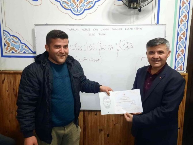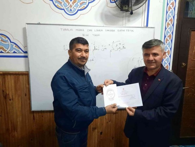 Cami İmam-Hatipleri Murat Yaşar ve Garip Hasan İlhan'ın çalışma hayatı yoğunluğu içerisinde dini eğitime vakit bulamayan vatandaşlar için başlattığı Kuran öğretimi programı katılım belgelerinin İlçe Müftüsü Ahmet Karagöz tarafından takdim edildi.