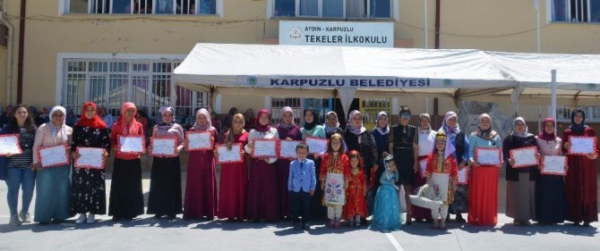Aydın’ın Karpuzlu ilçesine bağlı Tekeler Mahallesinde Karpuzlu Halk Eğitimi Merkezi Müdürlüğünce açılan Makine Nakışları ve El Sanatları Kursunu başarı ile tamamlayan köylü hanımlar hünerlerini sergiledi.