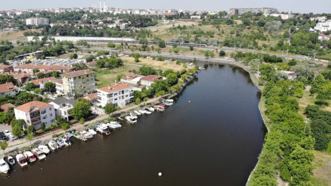 İstanbul Küçükçekmece'de bulunan Menekşe Deresi'nin rengi kırmızıya büründü. Çevrede kötü kokuya neden olan dere havadan görüntülendi.