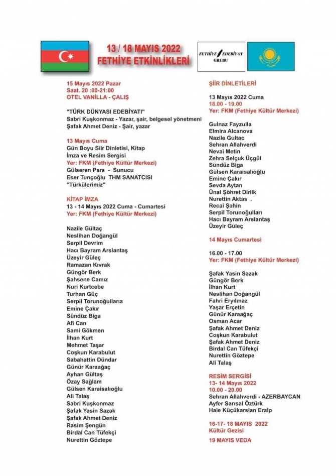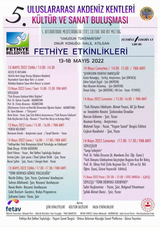 13-15 Mayıs tarihlerinde yapılacak olan "5. Uluslararası Akdeniz Kentleri Sanat Buluşmaları Fethiye Etkinlikleri" ne katılımın oldukça yoğun olduğu bildirildi. Yurtiçinden ve yurtdışından birbirinden değerli yazar, şair, ressam ve öğretim üyesinin katılacağı etkinlik 13 Mayıs Cuma günü saat 14.00" da Beşkaza Meydanındaki Atatürk Anıtı'na çiçek konulması, saygı duruşu ve İstiklal Marşı'nın okunmasıyla başlayacak . Aynı gün Azerbaycan'dan gelecek olan Şair Nazile Gültaç ve ünlü ressam Sehran Allahverdi Fethiye" deki Karabağ caddesini ziyaret ederek saygı duruşunda bulunacakları ifade edildi. Daha önce çeşitli etkinlikler nedeniyle Fethiye'ye gelen sanatçı Nazile Gültaç, Karabağ zaferinden sonra ilk kez Fethiye'ye geleceğini belirterek, Karabağ Caddesi'nde ülkesine ve Türk Dünyası ülkelerine sevincini ve coşkusunu haykıracağını ve şehitler için dua edeceğini söyledi.