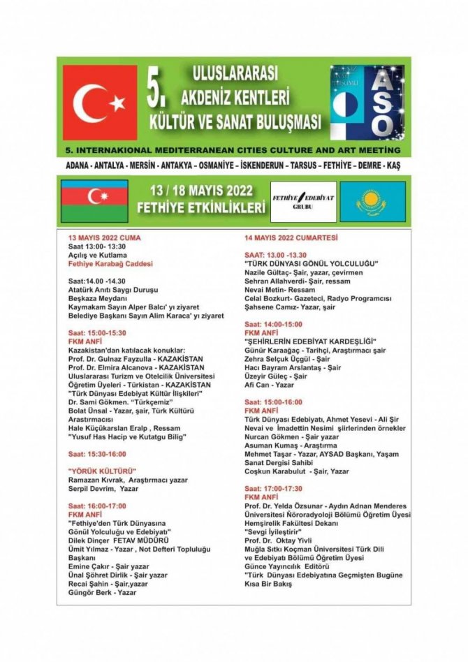 Akdeniz Kentleri Sanat Oluşumu (ASO) Fethiye Temsilcisi ve Fethiye Edebiyat Grubu Başkanı şair yazar Coşkun Karabulut da yaptığı açıklamada, Fethiyeli şair yazar, ressamlar ve kurumlar olarak Fethiye" ye yakışır bir edebiyat- sanat festivali için büyük bir heyecan içinde gayret gösterdiklerini söyledi. Festivale, Azerbaycan, İran, Kazakistanlı sanatçılar ve Fethiye ve Muğla bölgesi ile Antalya, Adana, Mersin, ve Aydın'dan da öğretim üyeleri ve sanatçılar katılacak. 15 Mayıs Pazar günü de topluca Ortaca" da kahvaltılı bir sanat buluşması gerçekleşecek.