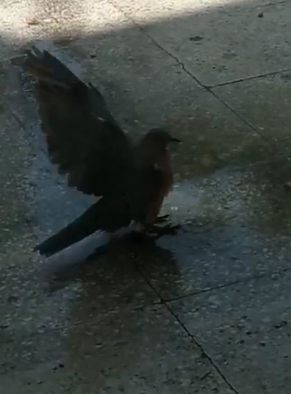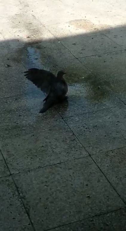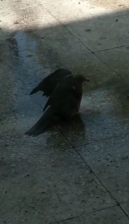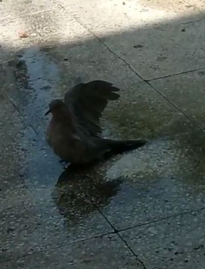 Antalya'da sıcak havadan etkilenen bir kumru, klima hortumundan akan suyla serinledi. Kumrunun o anları cep telefonu kamerasına yansıdı.