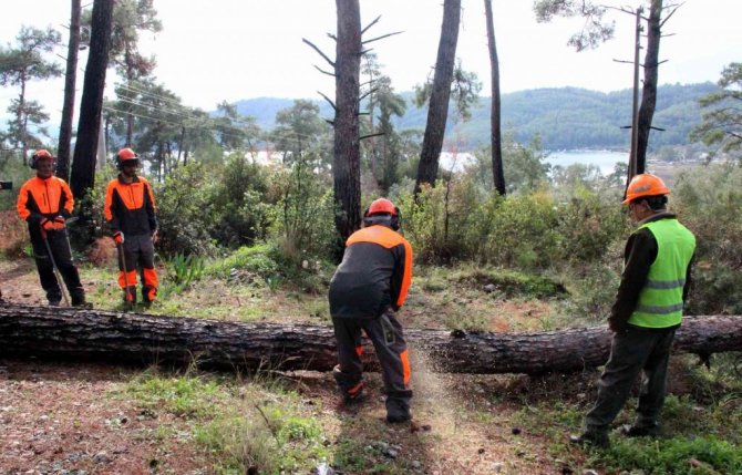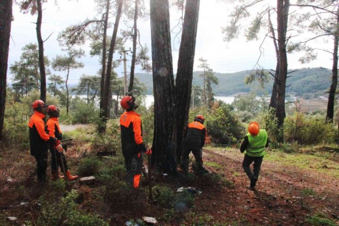 İki yıldır çok az yağışın düştüğü Muğla bölgesinde fizyolojik kuraklığın etkisinde kalan ve kaya zemin üzerinde yer alan Akbük koyundaki kuruyan çam ağaçlarının çevresindeki yeşil çamlara zarar vermemesi için Muğla Orman Bölge Müdürlüğü ekipleri, önce kuruyan ağaçları tespit ederek işaretledi. İşaretleme çalışmasının ardından ağaçlarda kesim çalışması başlatıldı.