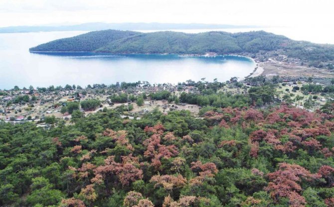 Kuraklık ve iklim krizi sonrası binlerce çam ağacının kurumaya başladığı Muğla'nın Menteşe ilçesi Akbük koyundaki çam ağaçları, Muğla Orman Bölge...